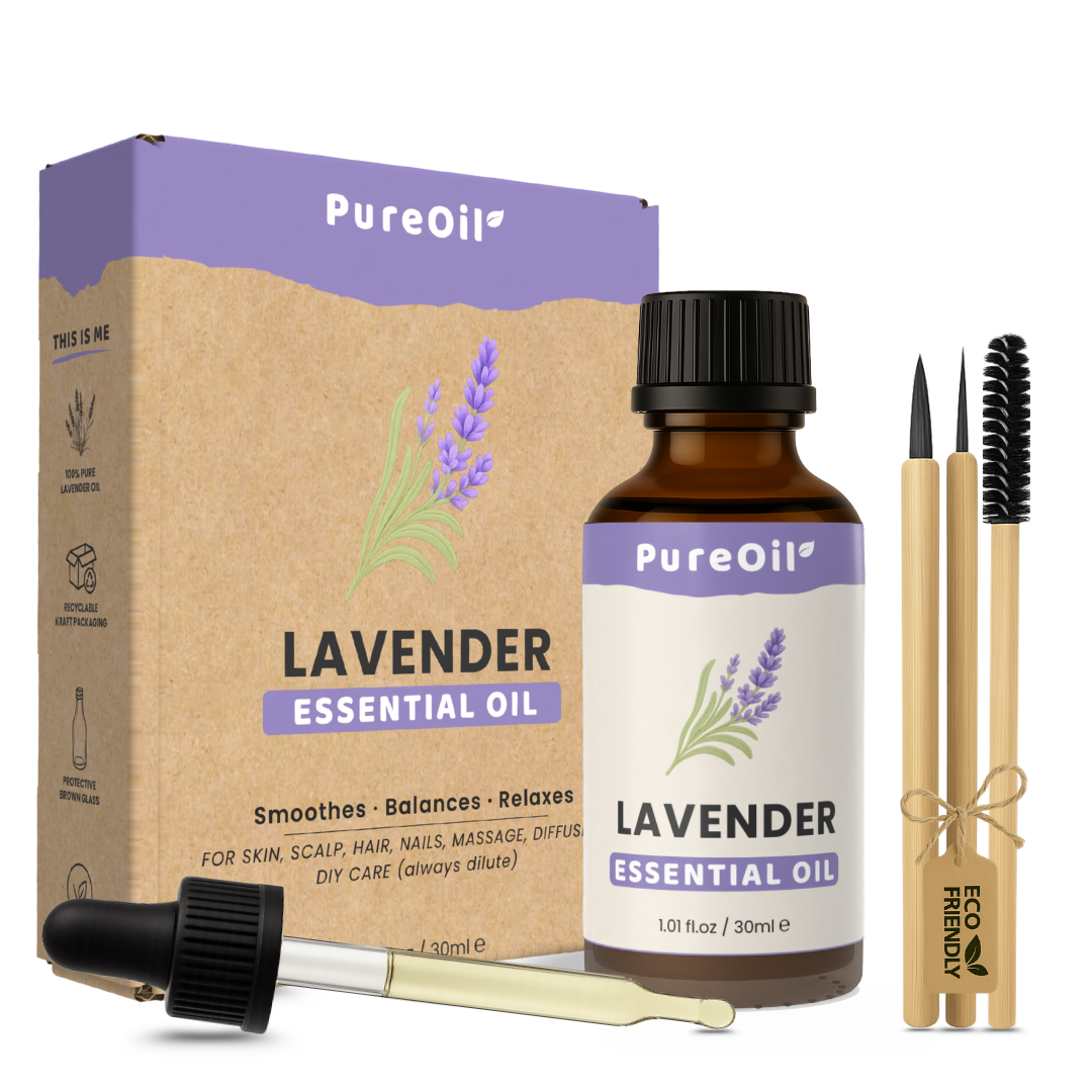 Let op: Etherische lavendelolie altijd verdunnen met een draagolie (zoals jojoba-, castor- of kokosolie) voor gebruik op huid, haar of nagels.