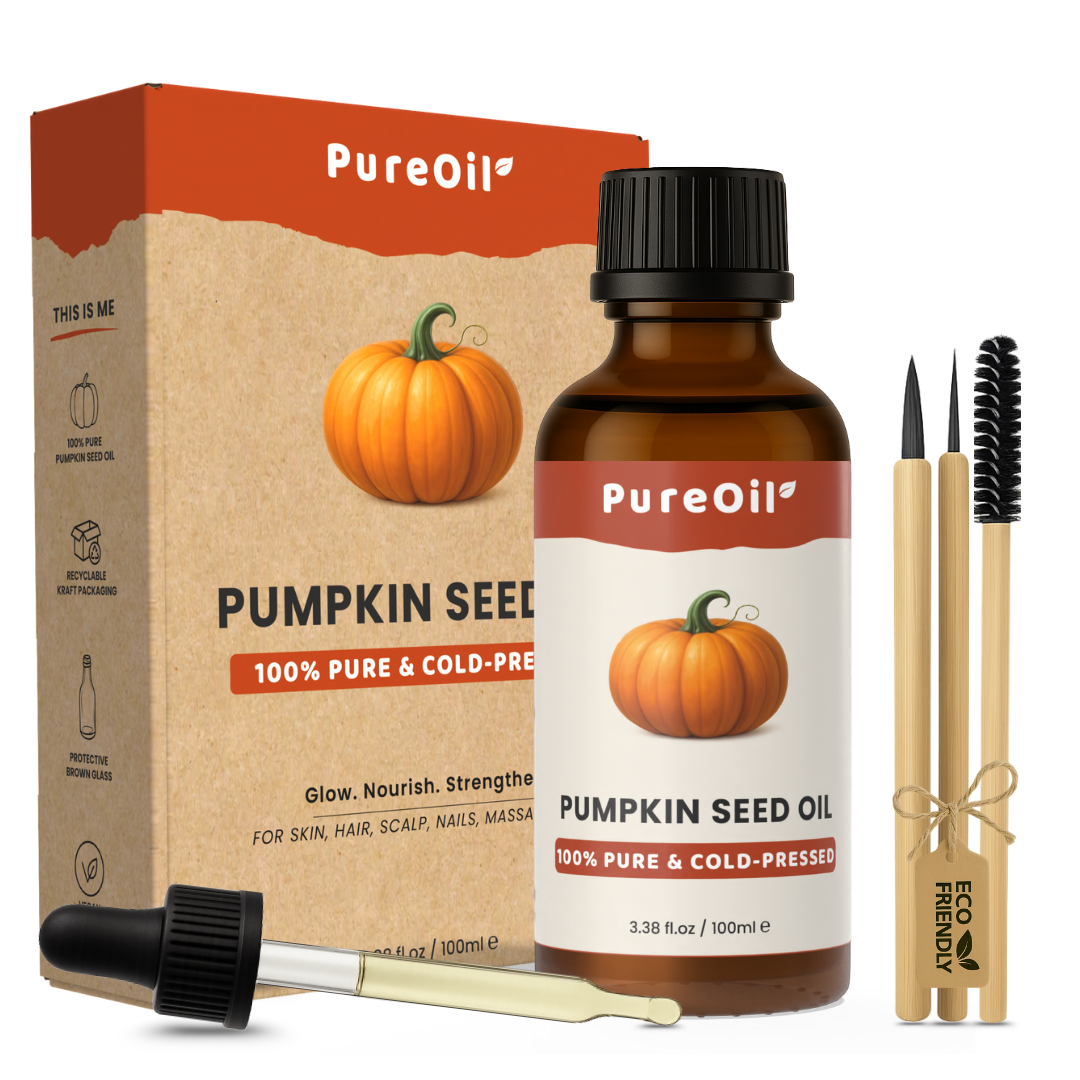 Let op: Pompoenpitolie kan puur of gemengd met een lichtere olie (zoals jojoba- of amandelolie) worden gebruikt voor een makkelijkere toepassing op huid, haar of nagels.